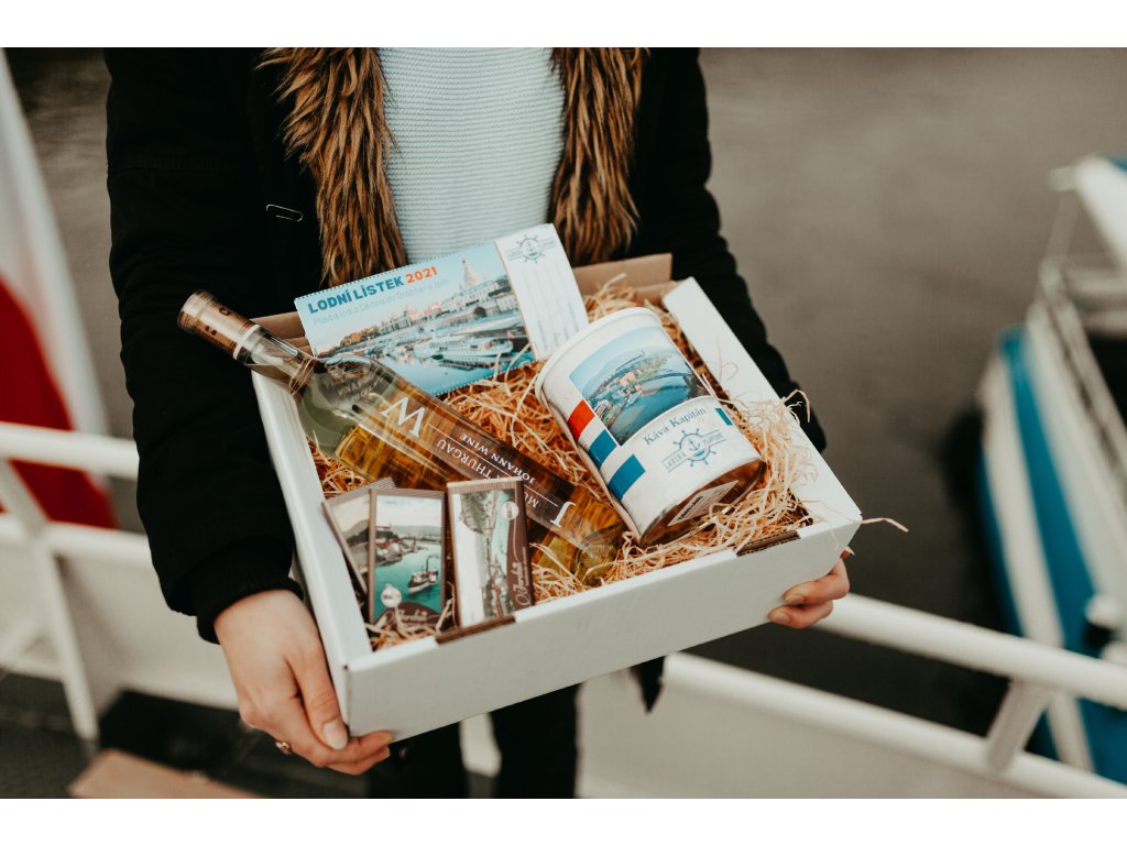 - dárkové balení podle uvedené fotografie (kartonová krabice, vyplněná dárkovými předměty a dřevitou vlnou)
